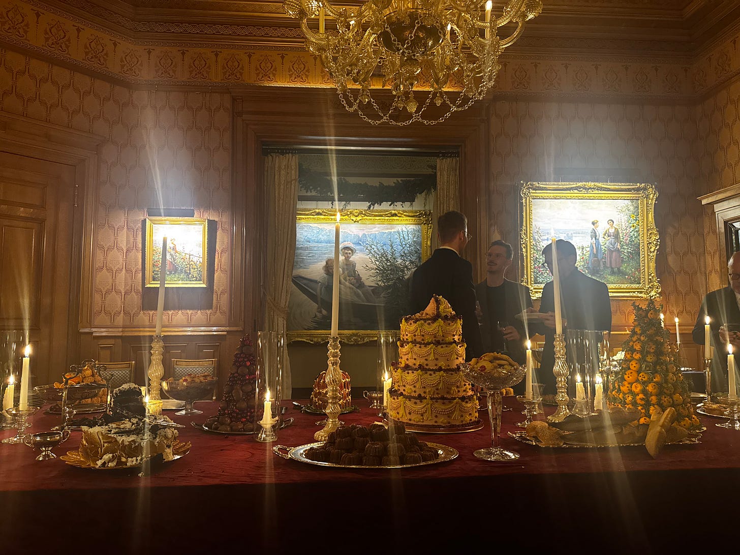 After a third drink, my vision was becoming Lynchian. The tablescape of layer cakes baked by Lauren Schofield looked like Christmas dinner at Hogwarts. And the butler was straight out of central casting. His job for the night was to part a crowd of writers and make way for a bagpiper (also out of central casting) to march around the room, while guests clamored around him to get the best angle for their Instagram videos.