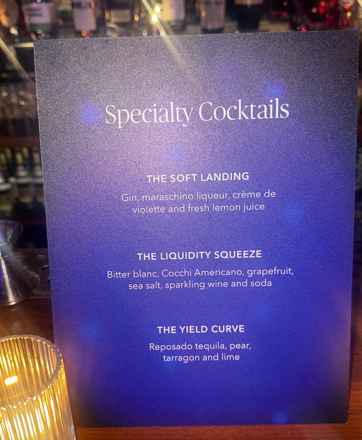 I want to talk to whoever is coming up with the names for these finance-themed specialty cocktails I’ve been served the past two nights.