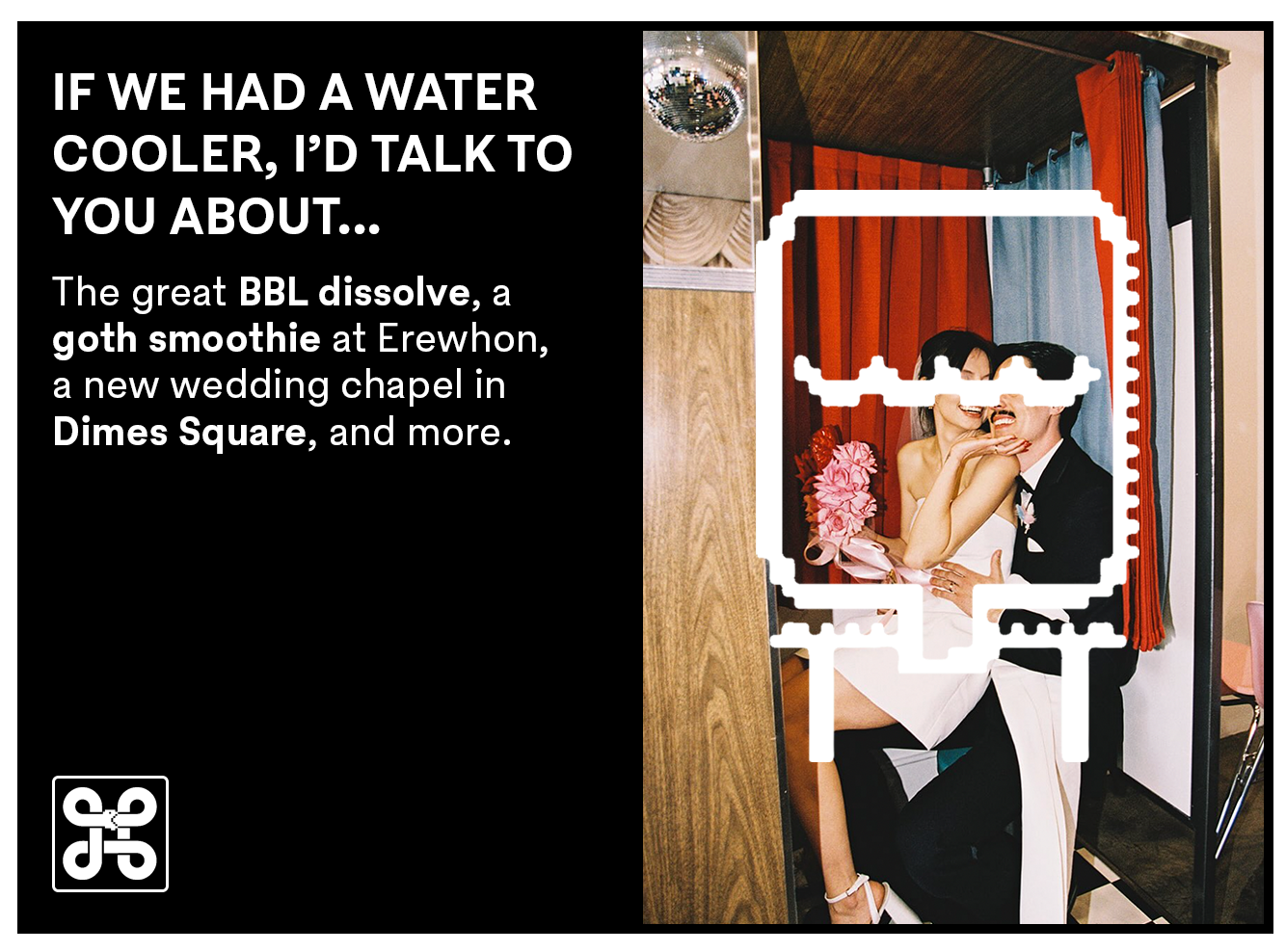 at Wild Cherry, the new restaurant from the Frenchette team in the Cherry Lane Theater. Within minutes of sitting down, we bumped into , and another friend texted me this morning that she had dinner there late last night. Their frog legs and Mondrian-like plating of tuna crudo made me happy. Afterwards, we saw No Other Choice at NYFF, which was a dark comedy about late-stage capitalism.Today’s letter includes: the great BBL dissolve, the post-Fashion Week scolding taking over my Substack feed, a new wedding chapel on the Lower East Side, and Williamsburg retail gossip from the Feed Me Tip Line.