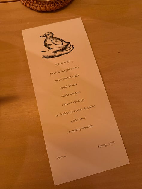 Last night I attended a dinner party in a stranger’s apartment. Sammy, a former Eleven Madison Park chef who now runs a supper club out of his space in Williamsburg, messaged me a few weeks ago and asked if I’d like to come to one of his Burrow dinners. I asked my friend Emma to come with me and we had a beautiful evening of vertical pasta and spring rhubarb and savory martinis. It was really fun and warm to be at a big table of strangers who were all curious about one another, with no insight into where we were from or what we did for a living.