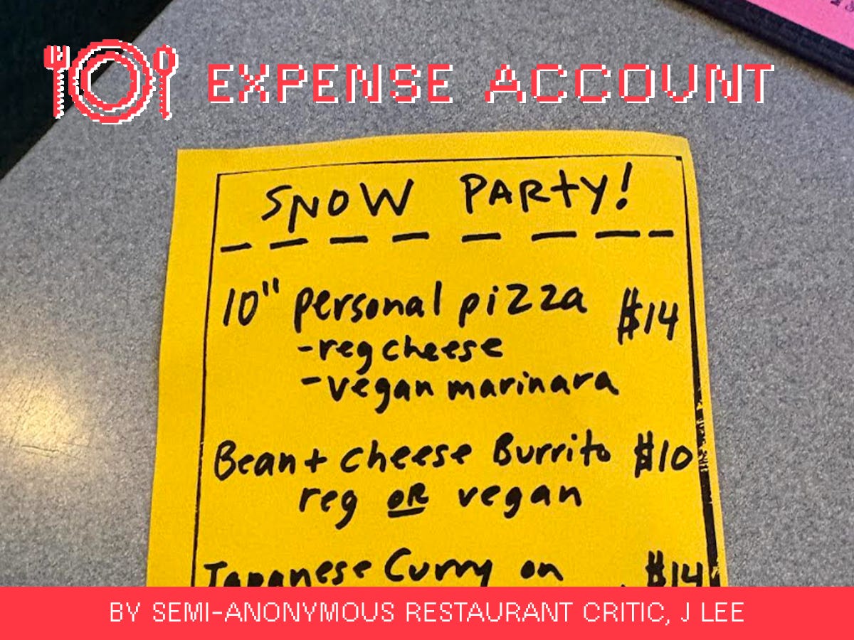 Expense Account is a series on Feed Me by semi-anonymous restaurant critic J Lee. He also hosts a podcast with the same name. Yesterday, while 11 inches of snow blanketed the city, he took a few minutes to reflect on the joys of snow day eating: