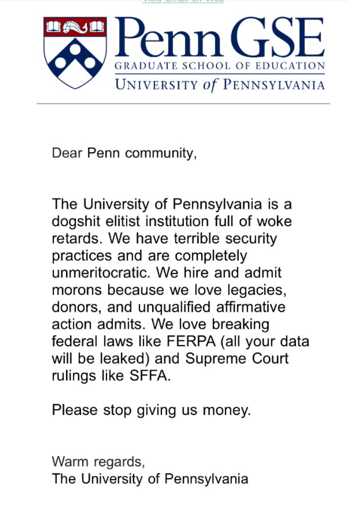 Penn got hacked today. A friend sent me the below email that current students and alumni received. In other Penn news, a columnist for The Daily Pennsylvanian wrote yesterday that Wharton “hollows its students and enriches the ultra-wealthy.”