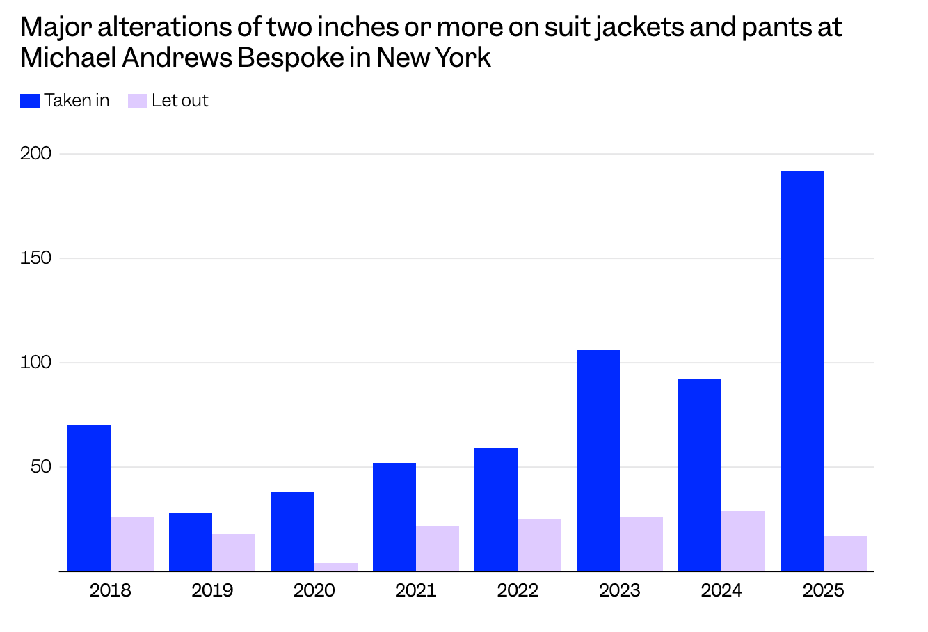 Wall Street tailor Michael Andrews has been working hard for all the newly skinny finance guys who recently discovered Ozempic. There’s a fantastic chart in this Business Insider story that shows the spike in the amount of suits and pants he’s taken “two inches or more” off.