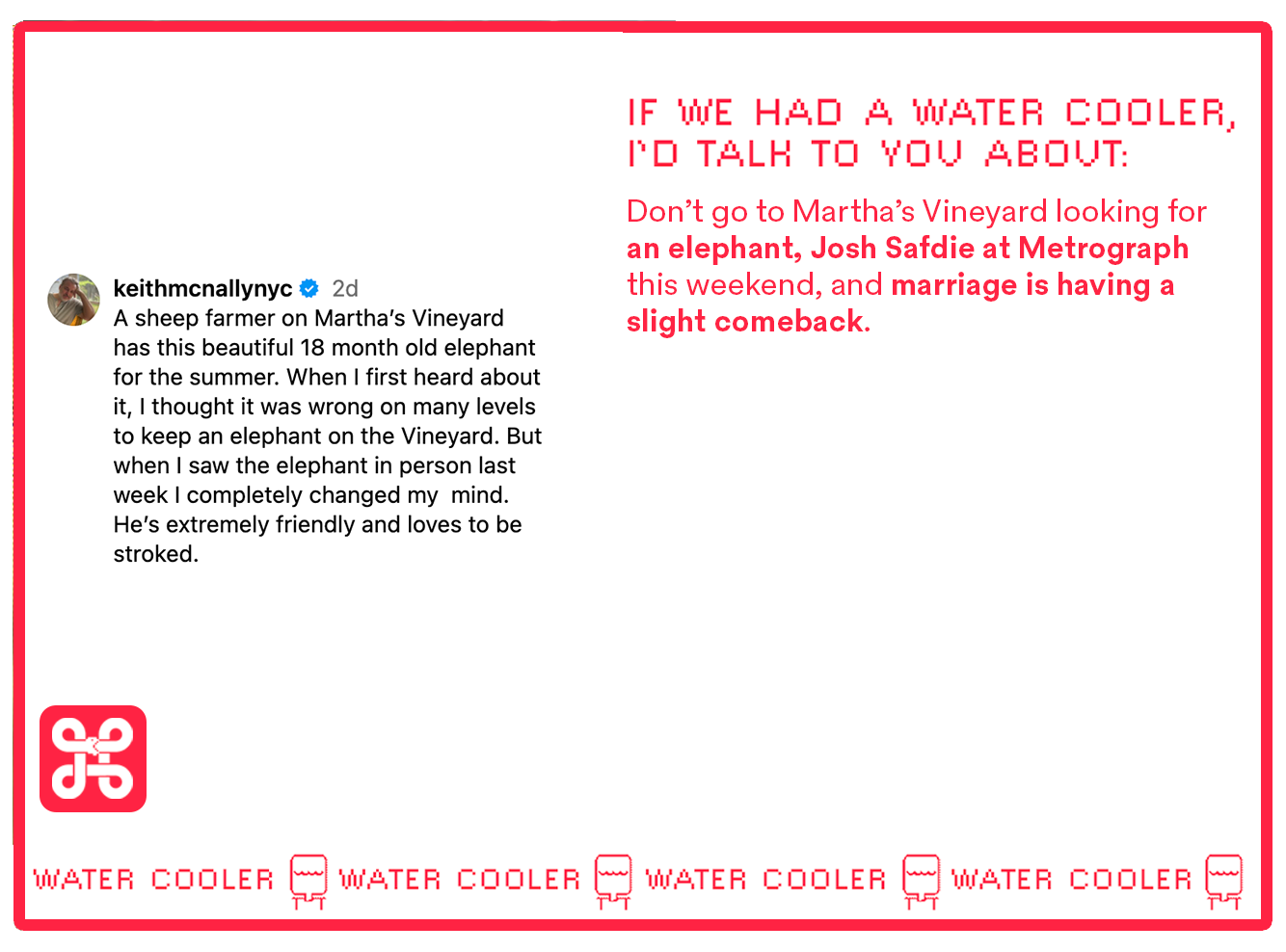 Today’s letter includes: the mystery of Keith McNally’s Martha’s Vineyard elephant, your Celsius might (accidentally) have alcohol in it, people can hear your Zoom therapy, and pour a spritz out for the closure of 30 Rock’s Italian cafe.