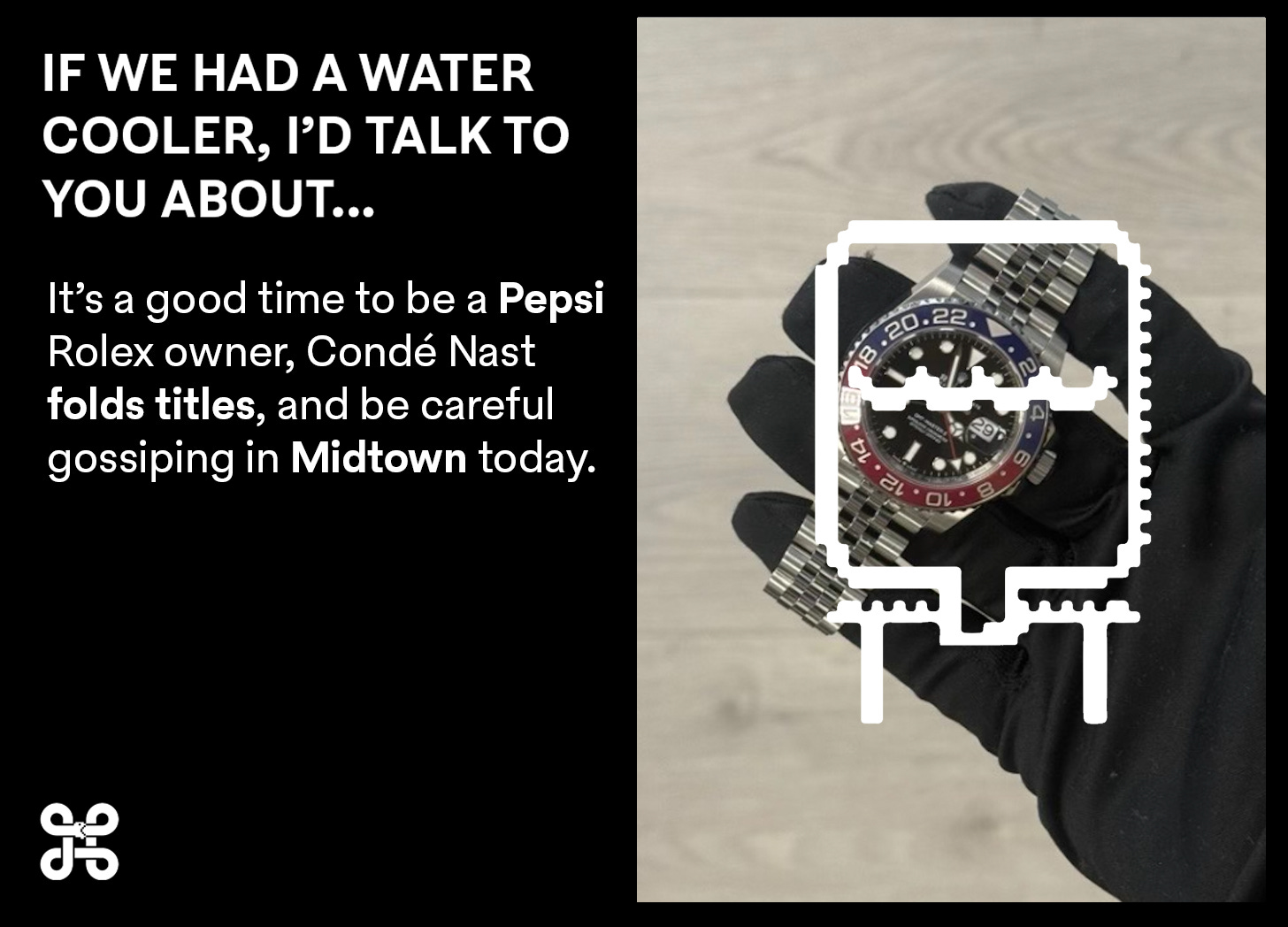 Today’s email includes: Changes at Condé Nast, a reason to avoid gossiping in Midtown today, Morning Brew’s new vertical launching next month, and news for those of you who are wearing a Pepsi Rolex right now (at the office? really?).