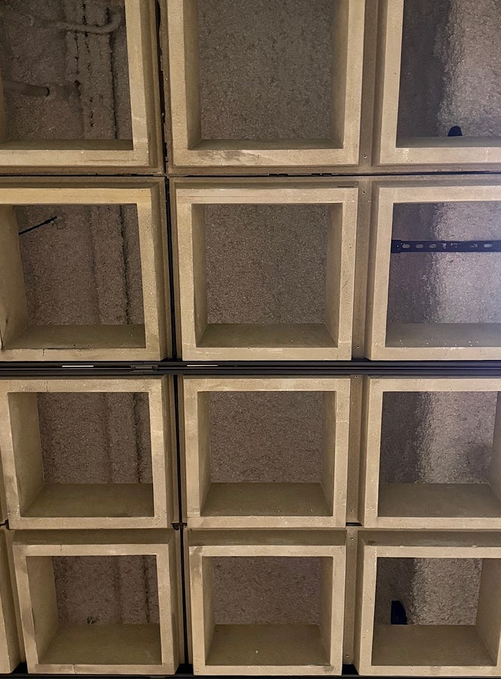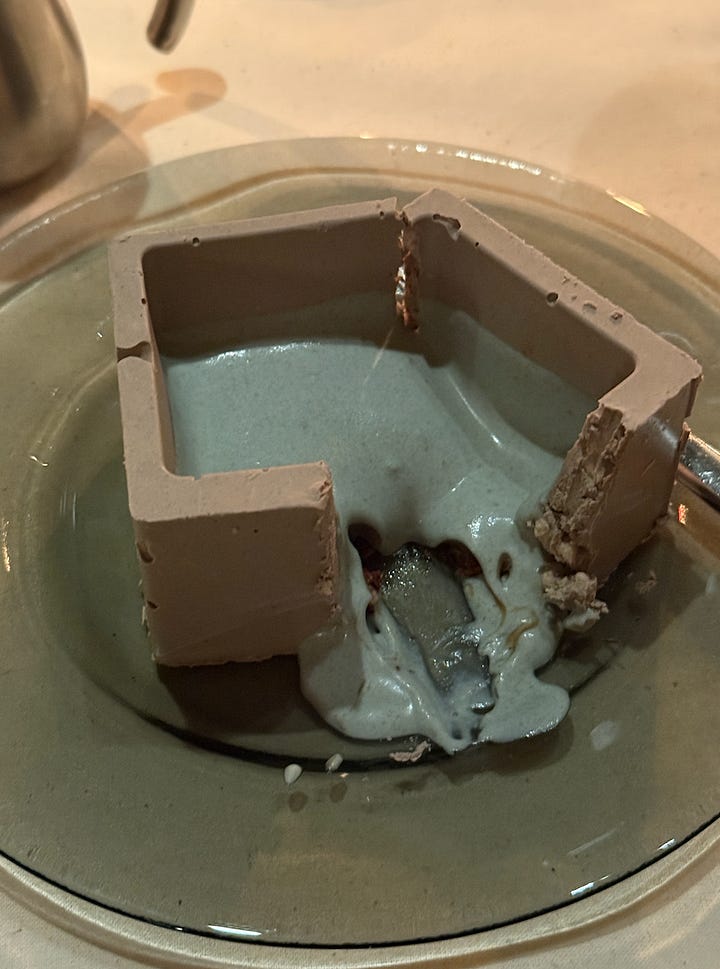 made the gianduja dessert, which was inspired by the suspended concrete waffle ceiling. “When I started thinking about how to recreate the concrete coffered ceiling of Marcel Breuer’s iconic building in dessert form, a square tartlet initially came to mind,” she told me. “However, the pastry shell would have needed to be quite thick to achieve the right proportions, and all I could think about was the sound of 170 forks loudly scraping against glass plates as everyone tried to cut through the crust.”