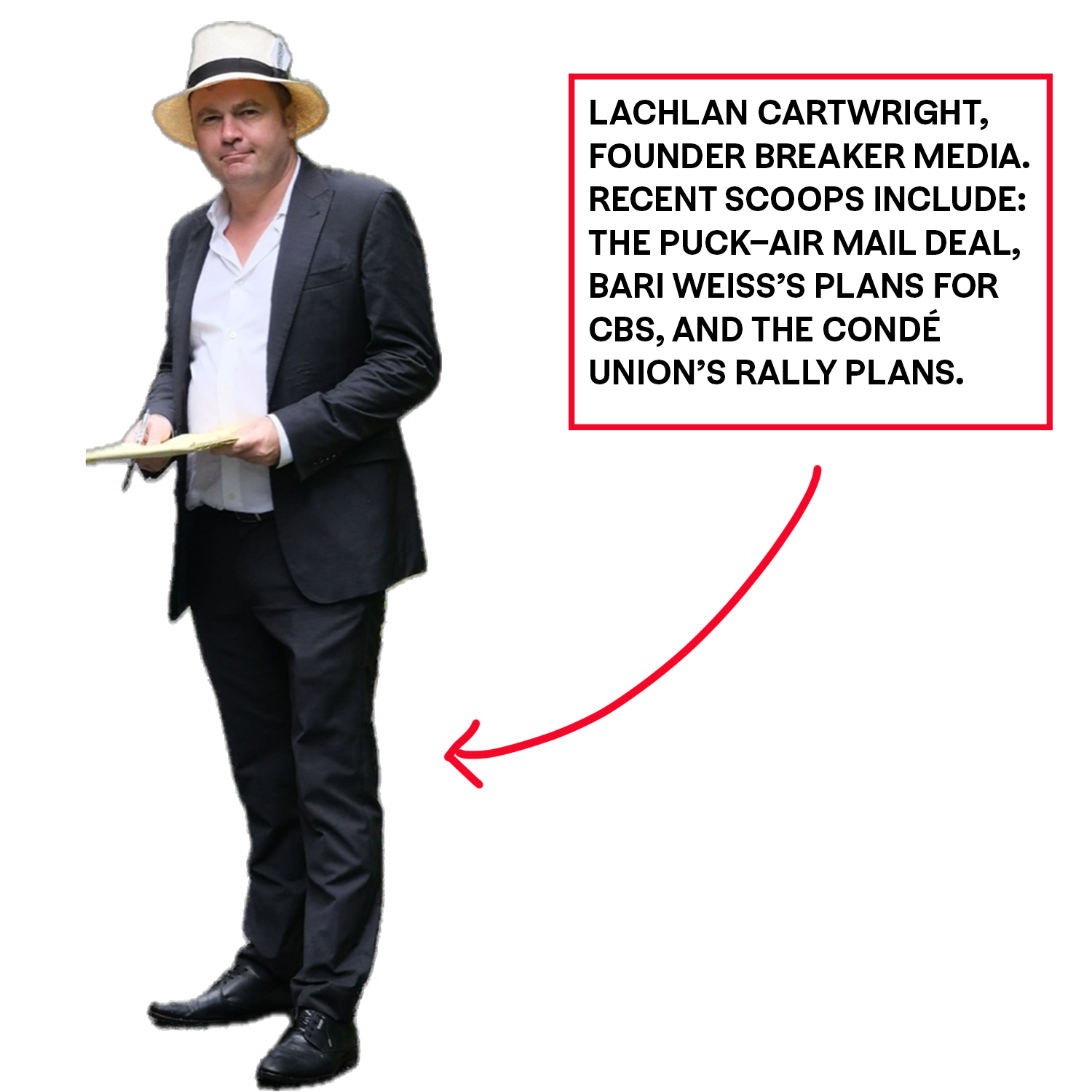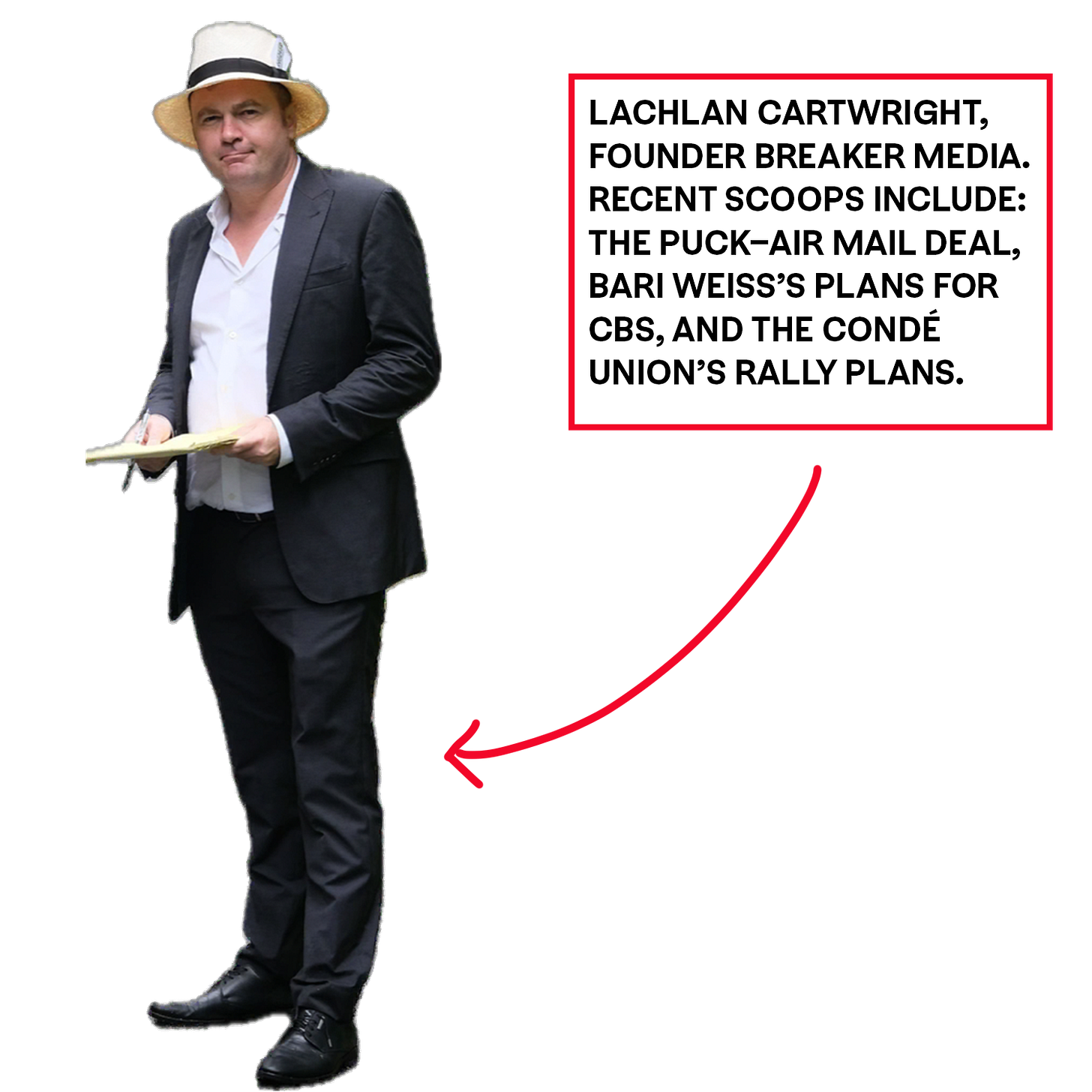 Lachlan Cartwright, former executive editor of the National Enquirer, Vanity Fair contributing editor, and founder of Breaker Media (home of notoriously scoop-y scoops, leading to speculation in the Feed Me chat about who his “deep throat” might be).