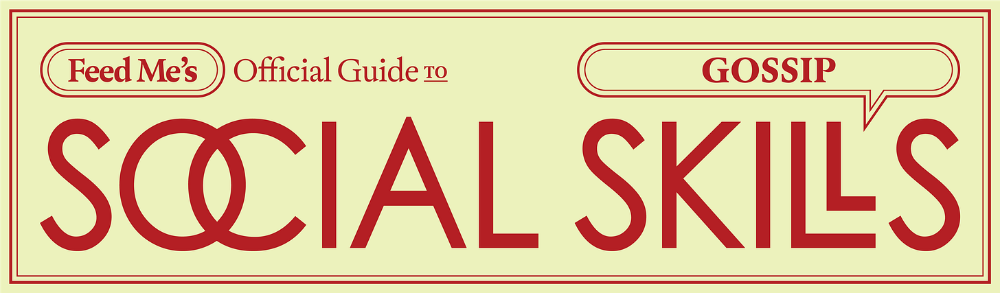 has put together something I consider even sweeter than dessert: a guide to gossip, according to professional gossipers. I’ve watched her painstakingly hone her craft the past few months: staying at the bar until last call, spending time with and giving respect to sources, and treating party reporting in the most exciting city in the world as an art.This newsletter is best enjoyed in the backseat of a long car ride, on a smoke break with your cousins, or when you’re “answering a work email.” And for those of you looking for more icebreakers for tonight’s dinner, head to the Feed Me chat.