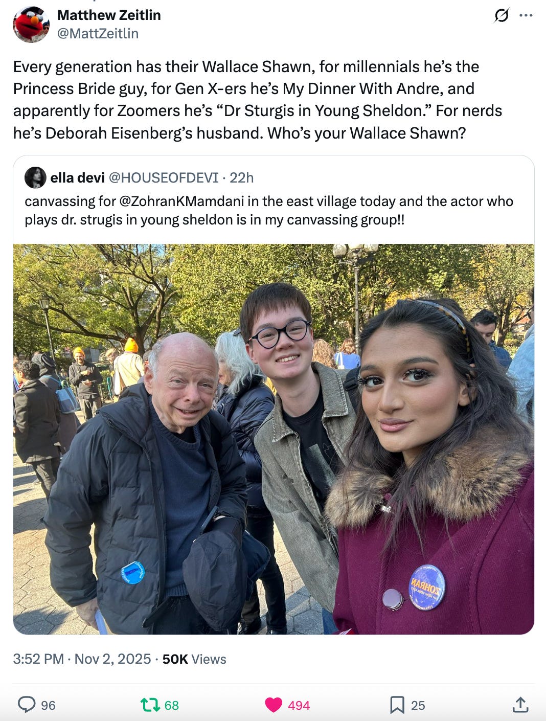 Meet Ella Devi, the Zohran canvasser who went viral yesterday for saying Wallace Shawn (living legend) was known as “the actor who plays dr. strugis in young sheldon.” Most responses were along the lines of “open the schools.” I spoke to 18-year-old Ella last night to find out what it was like to be the catalyst of WallaceGate. Her take: “all the old people getting mad at me on the internet because i totally forgot Wallace Shawn was in clueless and also the princess bride both of which i have actually watched because i’m not an idiot need to go do something better with their time (canvas for Zohran Mamdani).”