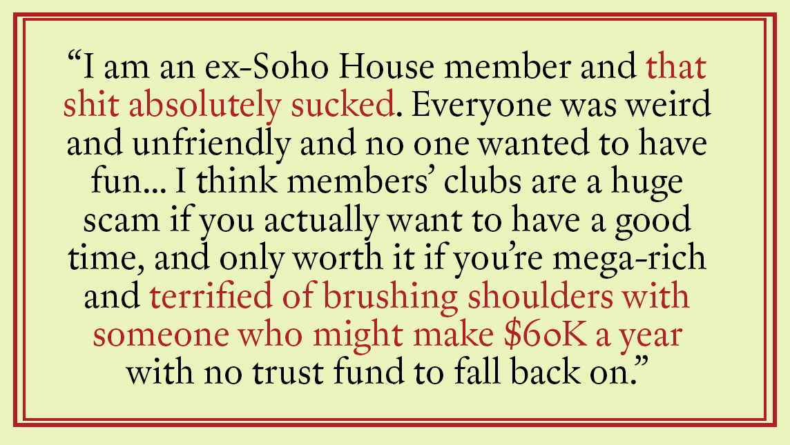 “I am an ex-Soho House member and that shit absolutely sucked. Everyone was weird and unfriendly and no one wanted to have fun at their events. I think members’ clubs are a huge scam if you actually want to have a good time, and only worth it if you’re mega-rich and terrified of brushing shoulders with someone who might make $60K a year with no trust fund to fall back on.” (F, 25-34, media marketing, Williamsburg)