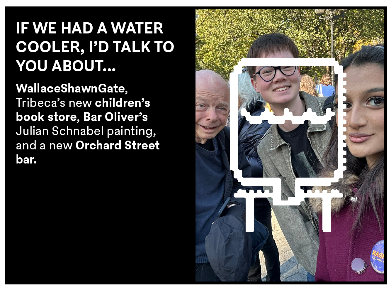 Today’s newsletter includes: Feed Me’s monthlong party package, Bar Oliver has a Julian Schnabel, an 18-year-old Zohran canvasser learns who Wallace Shawn is, and Tribeca moms want more international children’s books.